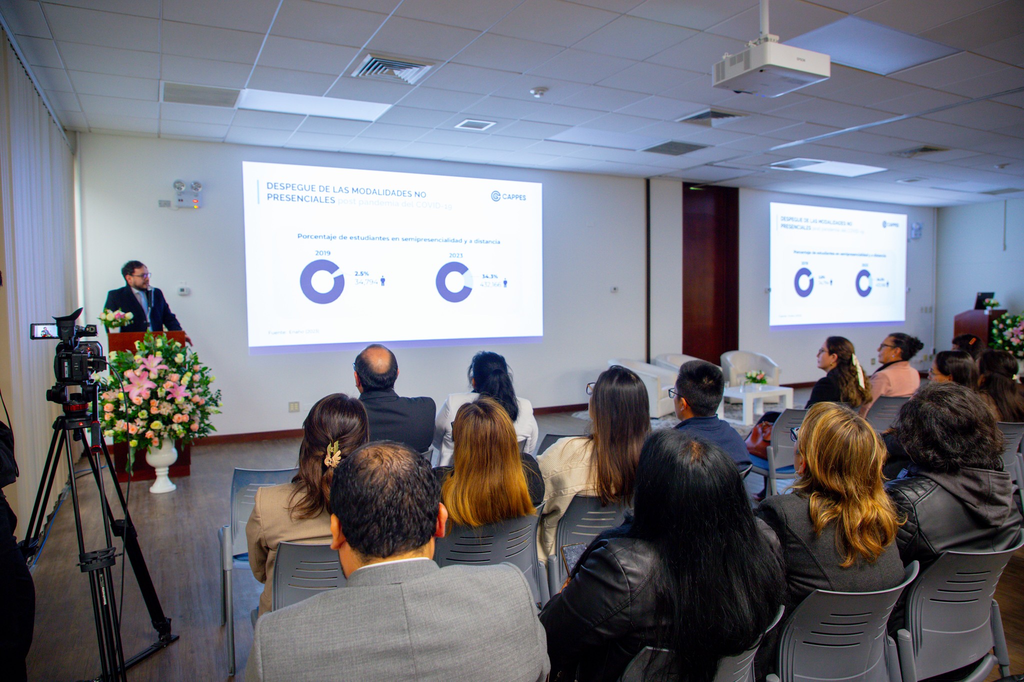 La jornada se abrió con la ponencia del Mag. Jorge Mori, director ejecutivo del Centro para el Análisis de Políticas Públicas de Educación Superior (CAPPES), quien destacó tendencias como la concentración de instituciones, la expansión de modalidades no presenciales, la incorporación de estudiantes no tradicionales y los riesgos de una regulación pendular. Señaló, además, que la gobernanza académica y la sostenibilidad serán claves para garantizar calidad y pertinencia en los próximos años.