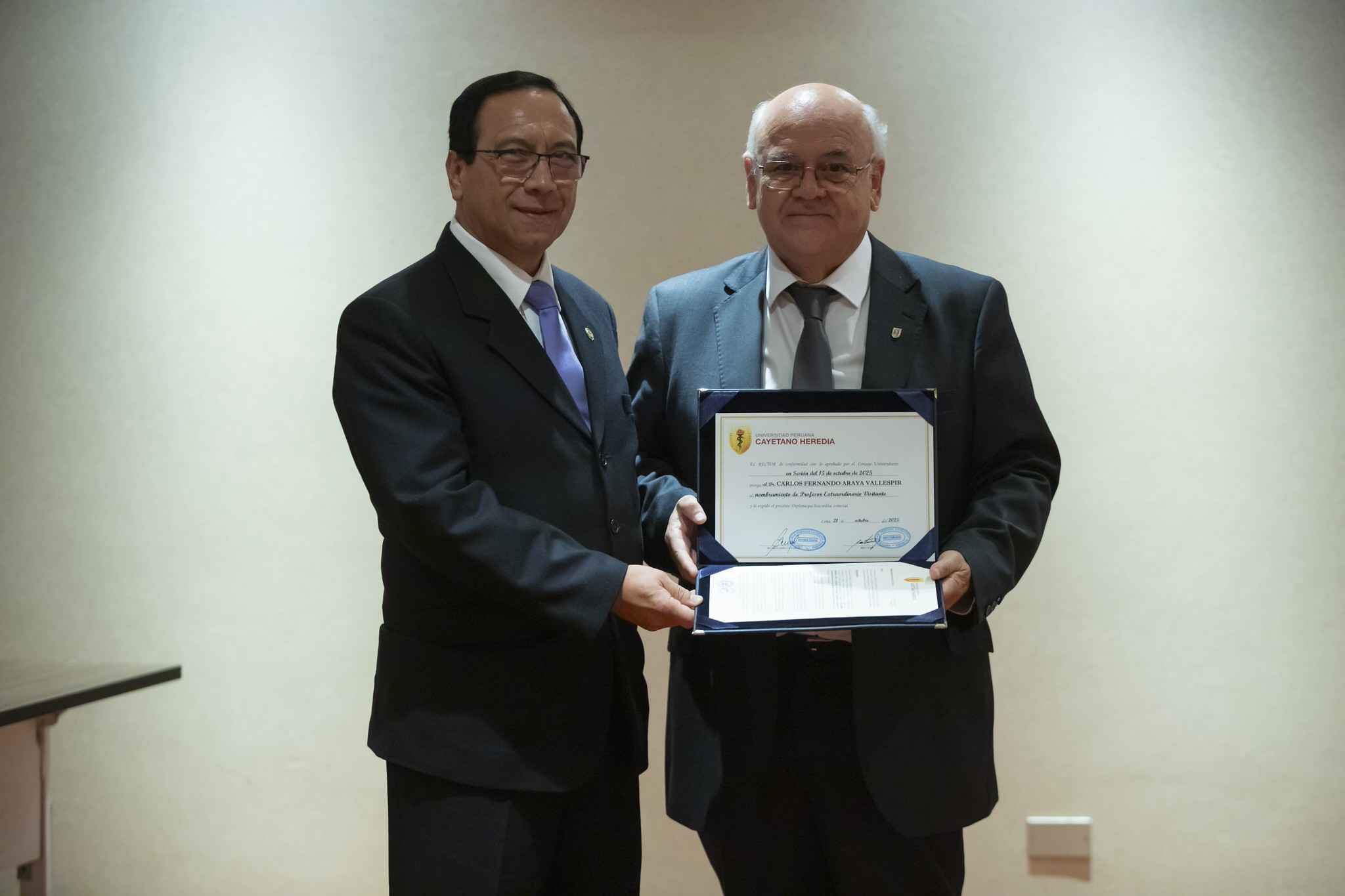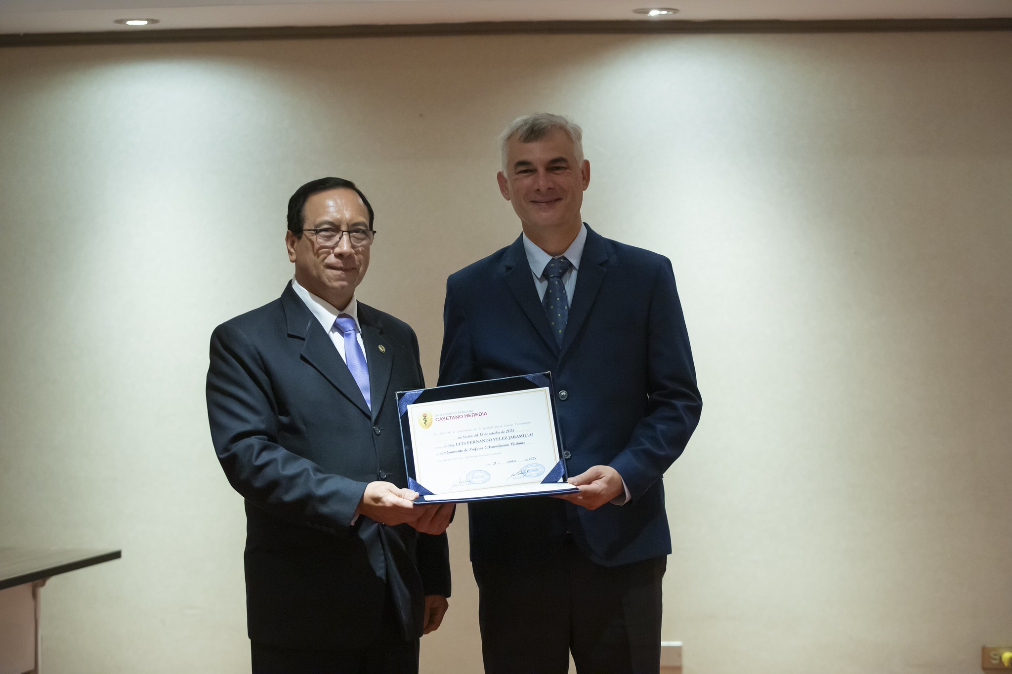 Asimismo, fue distinguido como Profesor Extraordinario Visitante por cinco años el Mag. Luis Fernando Vélez Jaramillo, odontólogo y especialista en Diagnóstico en Medicina Oral por la Universidad CES (Colombia), magíster en Administración por la Universidad Pontificia Bolivariana y actual decano de la Facultad de Odontología de la Universidad CES, en Medellín, donde lidera iniciativas orientadas al fortalecimiento de la formación especializada.
